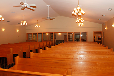 There is a large and well lit chapel that provides seating for up to 200 with seating in the side room providing seating up to 300. The side room off the chapel serves as a third visitation room, additional seating for chapel services, and as a reception room.